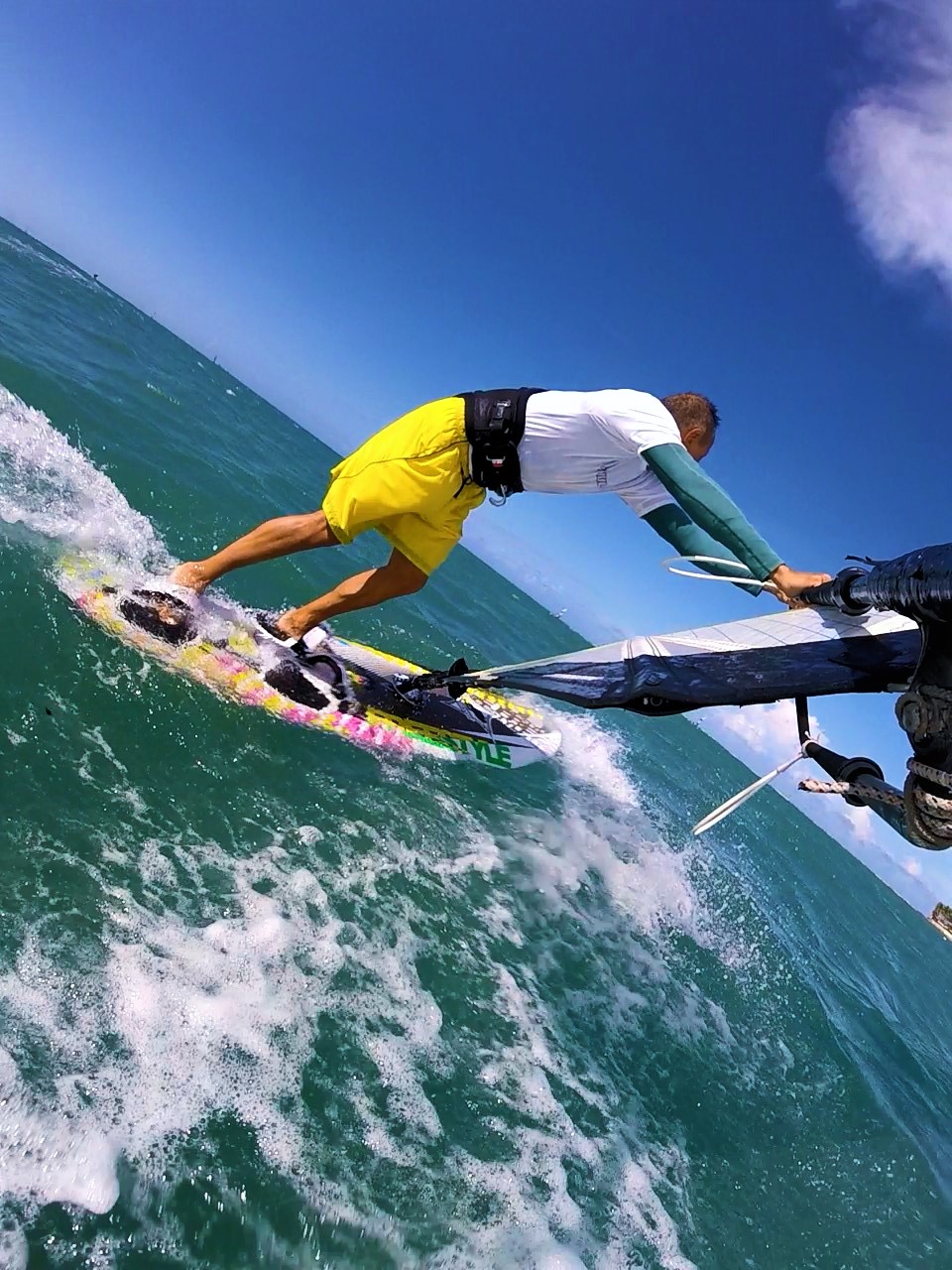 In this snapshot you can see how much tail is in the water and yet I'm nose diving in the chop while planing. This shows that the board needs attention when sailing along and will just not auto-pilot. It wasn't nearly as skatey as the Evo I tried previously, but still lacked drive for my application. The tail just doesn't carry enough power to cruise through lulls when sailing underpowered or hitting wind shadows.