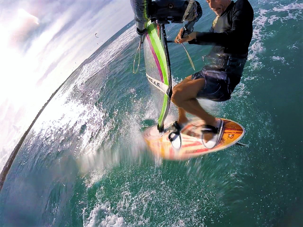 - I never thought, I'd be slapped around so much, even on backloops, landing flat on back, ribs, neck, whiplash, arms, everything is sore... June 2017, Resisting the Rotation - 20-30 attempts per session, comes at a cost! Pain is starting to show up but interestingly, it mostly came from landing on my ribs on a backloop attempt! Well then. Otherwise, unavoidable whiplash stiffens the neck a bit. But, I don't seem to care and keep at i! The more I do it, the more I improve and learn. More photos with comments here. So on these last attempts, everything ends up often in a catapult once the board hits the water. My back arm isn't enough back, my front arm not straight enough and above all my body not forward enough to set off the rotation. I need to concentrate on pulling up on the boom with the front leg bent (need to push on back foot to jump). Everything else isn't too bad for now. My head is looking back, the pop is fine with a good redirection off the wind. It's important to try not to let go of the back hand, if not the mast will dig in, off the wind it's ok, but it may hit the board or give whiplash from a flat landing on the back (adding protection to the board or the mast is a good idea). More photos with comments here. Beginning of June 2017, Daily Attempts! - I am now trying them quite frequently, on a wave or not, on both tacks. Sometimes it ends in a Grubby-like move, other times the pop is is slowed down by the rotation from timing being off. I need to focus on pop and front hand throw to load the sail. Mai 2017, More Attempts! - Ok, after some decent conditions with more organized conditions and solid winds, I have been trying a few attempts up to 20-30 per session. Mostly I do about 4 or 5 per session. I like trying them on both tacks. Sometimes my surfing side is better, other times my jumping side. I've been struggling with combining the pop (which lifts up the mast foot) and the sail throw (which drives down the mast foot) and tend to avoid throwing them when really powered or on big waves. Most my attempts are when nicely powered off of a nice clean small piece of chop or small wave that I can hit heading downwind with enough but low speed! More and more it looks like I'm going to have to throw them in the "real" waves to take it to the next level! It finally may be coming, woo-hoo! Aug 2016 - Apr 2017, The void - Well, since April, there have been a couple of (shy) attempts more but above all the wind has been mediocre at best! So it's been Surf Sailing for most of the year. On the other side, thanks to some friendly swell early in the year, I managed my first backloop attempts about 20 over the whole year. The forecast for February (an excellent month here) is looking really good so I am quite optimistic!